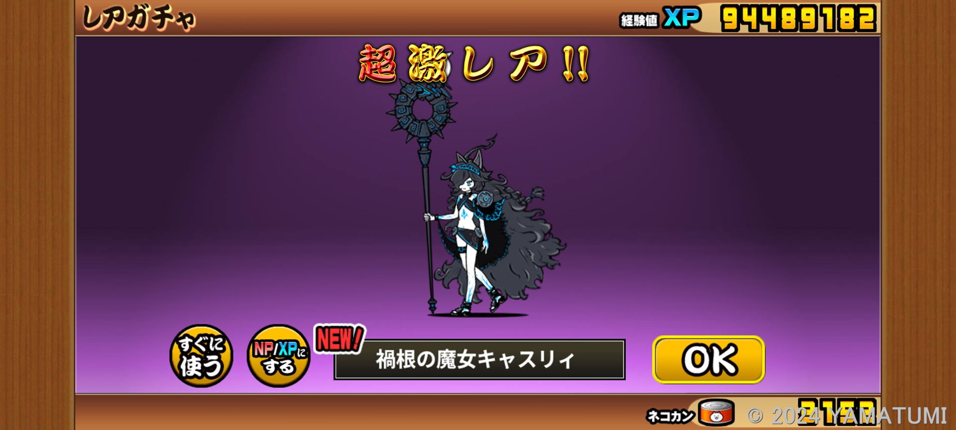 過去に数千円程課金したことがありますがここ数年は完全無課金で遊んでます。このゲームにも人権キャラが何体かいます。にゃんま、黒キャス、白フォノウです。この中で黒キャス(2020年5月1日実装)だけ全く出る気配がありませんでした。毎年1月には最強ガチャイベントがありとりあえず何か当たるといいなと思い貯めてたチケットでガチャを回してみました。すると…。